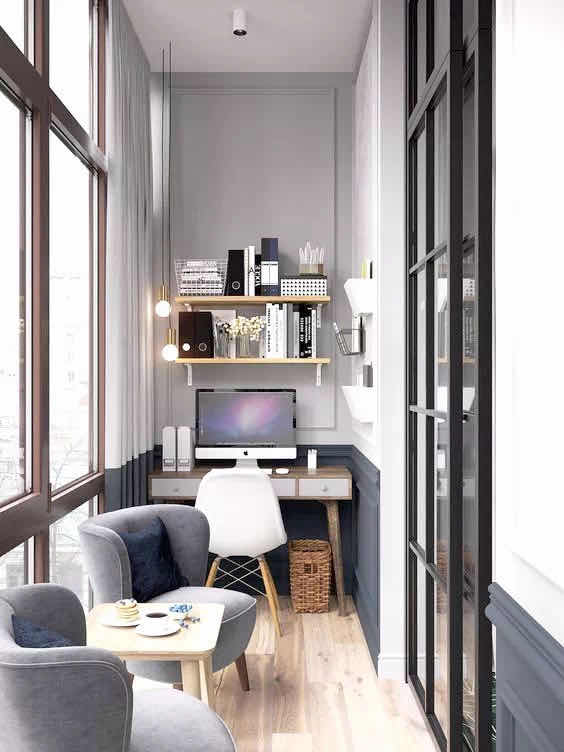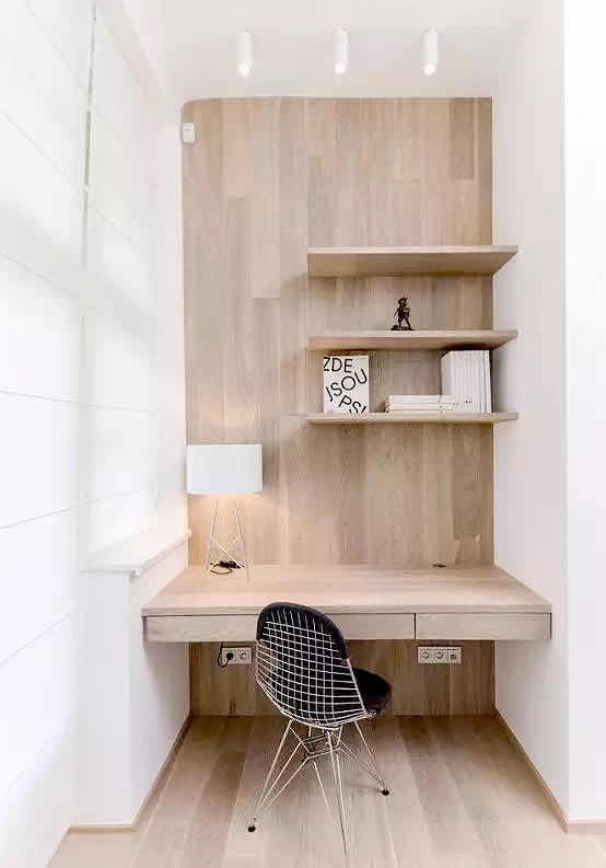 在陽臺做一個辦公區(qū)就相當(dāng)舒適安逸了,透明的大玻璃配上一條長長辦公板凳,一個簡約小工作室就誕生了,看著窗外繁華燈火連加班都變得格外有趣了。