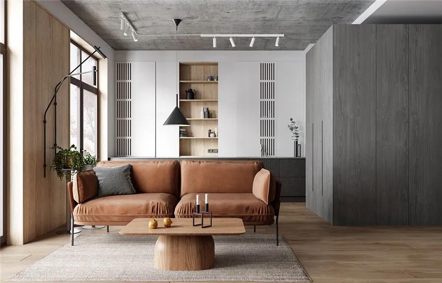 還有橘色的雙人沙發(fā)搭配木制的茶幾