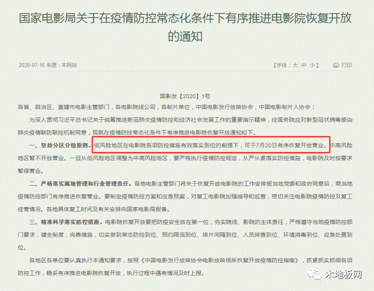 7月16日,國(guó)家電影局發(fā)布了這樣一條通知:低風(fēng)險(xiǎn)地區(qū)在電影院各項(xiàng)防控措施有效落實(shí)到位的前提下,可于7月20日有序恢復(fù)開(kāi)放營(yíng)業(yè)。