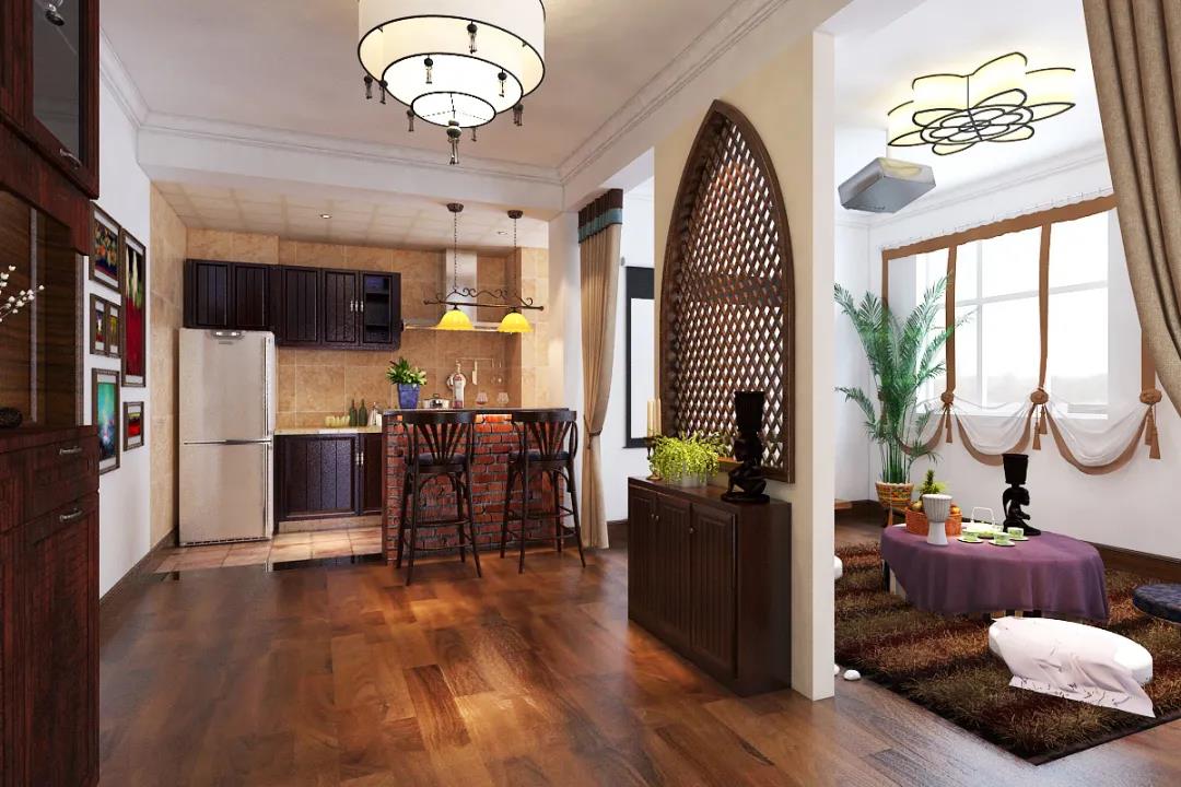 東南亞風(fēng)格,講究色彩艷麗,半啞光漆面黃色系地板,可以選擇拼花或者雙拼地板來(lái)搭配。