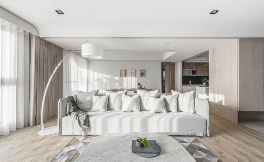 客廳公開(kāi)空間,采用木質(zhì)紋理清晰自然,色彩較為柔和的地板,以營(yíng)造明亮和諧的氛圍。