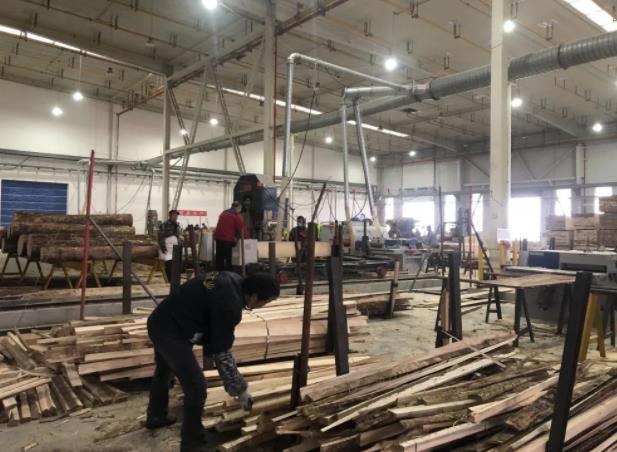 在進口原木加工倉庫內(nèi),幾名作業(yè)人員正將一塊原木段推進木工機械內(nèi)對木頭段進行切片作業(yè),切開后的木塊再由小號的木工機械完成成品板材的切割,車間內(nèi)共有6條生產(chǎn)線同時開工作業(yè),每條切割線均設有一條吸塵管道,將切割木材時所產(chǎn)生的鋸末吸干凈,車間內(nèi)呈現(xiàn)一片繁忙的景象。