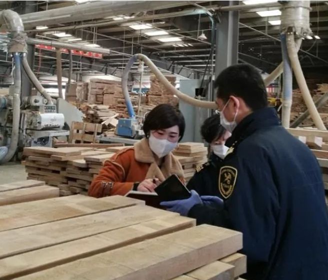 海關(guān)人員現(xiàn)場監(jiān)管出口木材貨品