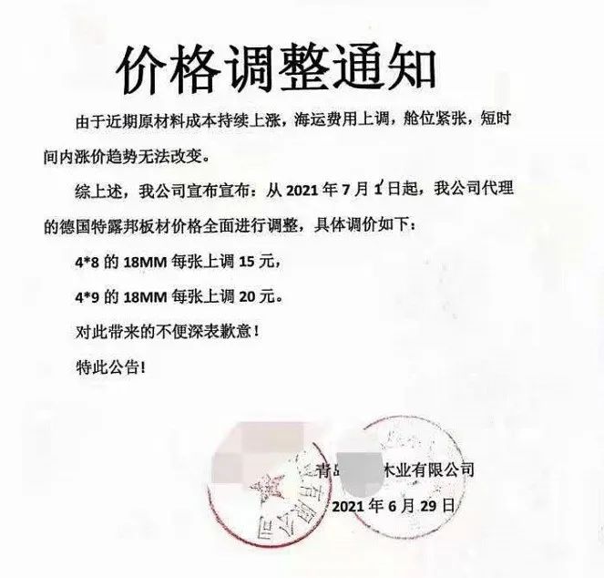 6月29日,青島某木業(yè)發(fā)布通知稱(chēng),由于原材料成本持續(xù)上漲,海運(yùn)費(fèi)用上調(diào),艙位緊張,短時(shí)間內(nèi)漲價(jià)趨勢(shì)無(wú)法改變。特宣布自2021年7月1日起,本公司代理的德國(guó)特露邦板材價(jià)格全面進(jìn)行調(diào)整,4*8的18MM每張上調(diào)15元,4*9的18MM每張上調(diào)20元。暴漲!7月1日起,一張板材價(jià)格漲15%!6月29日,青島某木業(yè)發(fā)布通知稱(chēng),由于原材料成本持續(xù)上漲,海運(yùn)費(fèi)用上調(diào),艙位緊張,短時(shí)間內(nèi)漲價(jià)趨勢(shì)無(wú)法改變。特宣布自2021年7月1日起,本公司代理的德國(guó)特露邦板材價(jià)格全面進(jìn)行調(diào)整,4*8的18MM每張上調(diào)15元,4*9的18MM每張上調(diào)20元。