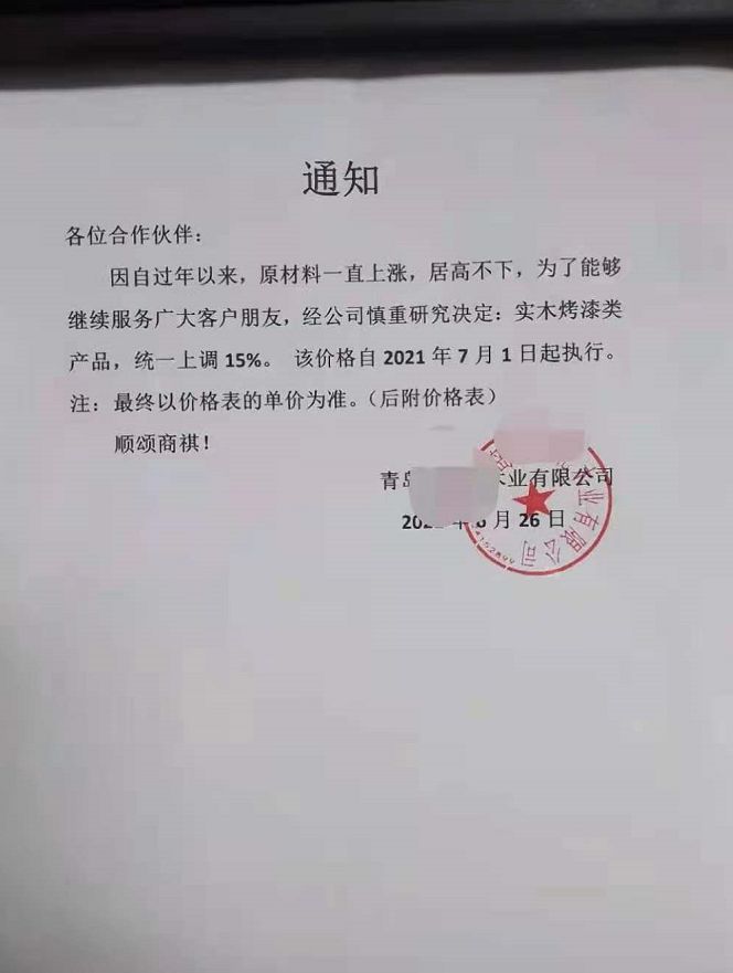 就在前兩天,也有木業(yè)企業(yè)發(fā)布調(diào)價(jià)通知,由于原材料一直漲,公司所有實(shí)木烤漆類(lèi)產(chǎn)品統(tǒng)一上調(diào)15%,該價(jià)格自7月1日起執(zhí)行。