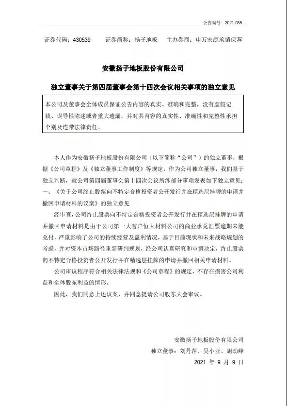 9月9日消息,揚子地板發(fā)布公告,于2020年3月13日召開第四屆董事會第二次會議,審議通過《關于公司申請股票向不特定合格投資者公開發(fā)行并在精選層掛牌》。2020年3月30日,召開2020年第一次臨時股東大會審議并通過了《關于公司申請股票向不特定合格投資者公開發(fā)行并在精選層掛牌的議案》等相關議案。
