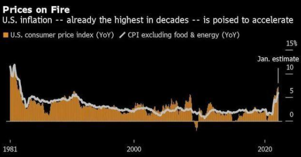 3、今晚,即北京時間周四(2月10日)晚間21:30,美國勞工部將公布1月消費者物價指數(shù)(CPI),此份數(shù)據(jù)將直觀呈現(xiàn)新年伊始美國物價水平的最新變化。目前,隨著人們對通脹高企的擔憂不斷加劇,美聯(lián)儲已經(jīng)在1月議息會議上釋放了將在年內(nèi)采取多次加息乃至啟動縮表的信號。目前,彭博社和路透社采訪的經(jīng)濟學家調(diào)查中值均預計,美國1月CPI同比增速有望達到7.3%,續(xù)創(chuàng)1982年2月以來的40年高位。同時,1月CPI環(huán)比增速有望達到0.5%,與上月持平。