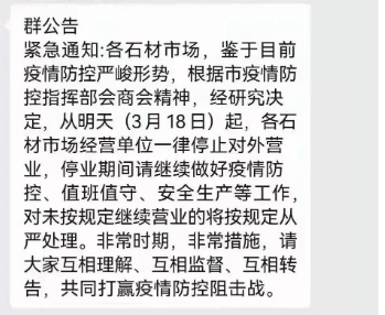 據(jù)福建衛(wèi)健委最新疫情通報(bào)的信息,3月21日0—24時(shí),福建110例,其中泉州市89例、莆田市16例、廈門市2例、漳州市2例、福州市1例;當(dāng)前泉州不少建材門店停止?fàn)I業(yè),水頭等地的石材市場(chǎng)關(guān)閉。