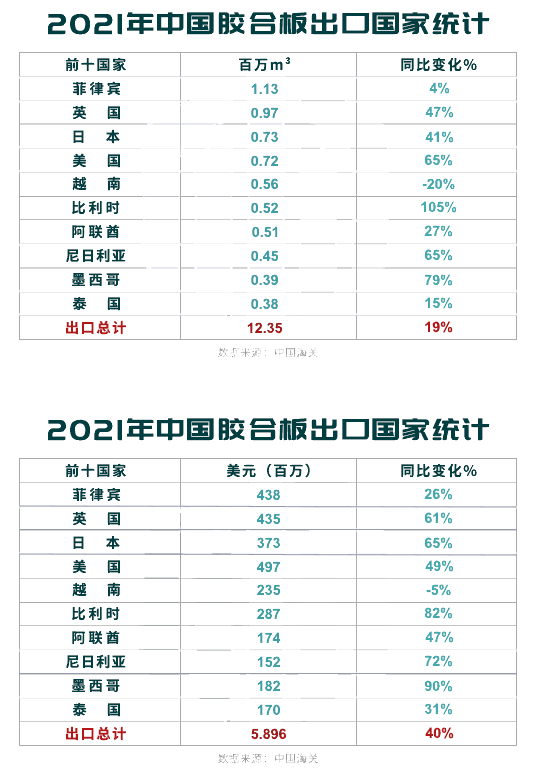 據(jù)中國海關(guān)數(shù)據(jù)顯示,2021年膠合板出口量達(dá)到1235萬立方米,價(jià)值58.96億美元,同比增長為19%,價(jià)值同比增長40%,這一數(shù)據(jù)也達(dá)到歷史出口記錄新高。1235萬立方米!中國膠合板出口創(chuàng)歷史新高據(jù)中國海關(guān)數(shù)據(jù)顯示,2021年膠合板出口量達(dá)到1235萬立方米,價(jià)值58.96億美元,同比增長為19%,價(jià)值同比增長40%,這一數(shù)據(jù)也達(dá)到歷史出口記錄新高。