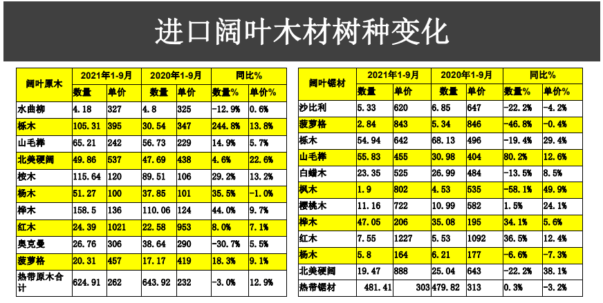 近年來進(jìn)口闊葉木樹種和比例的變化(見下表):